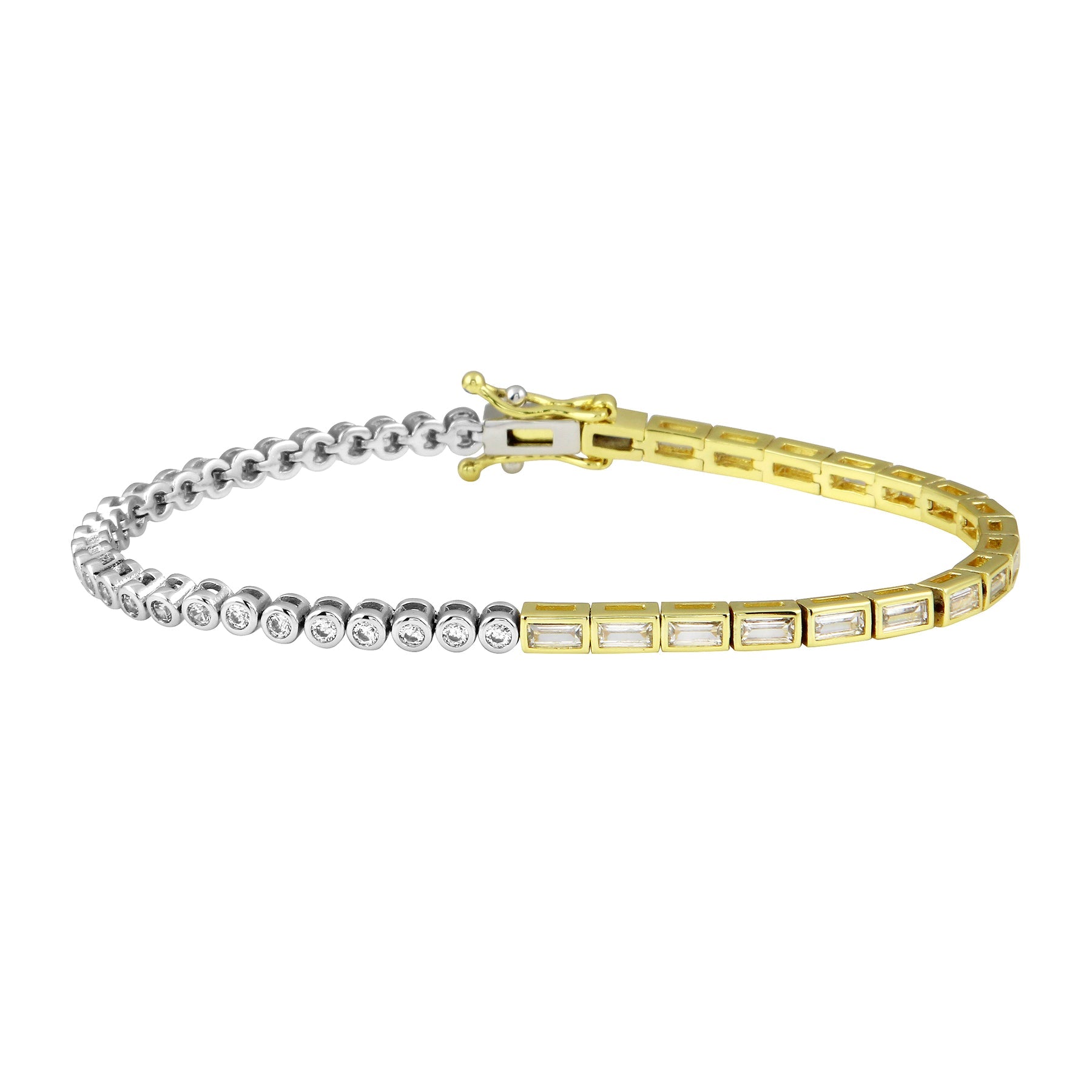 A series of shiny bezel-cut spheres and baguettes linked together in a golden chain. Wear solo to add a sophisticated pop of shine or stack it to make a fabulous statement.